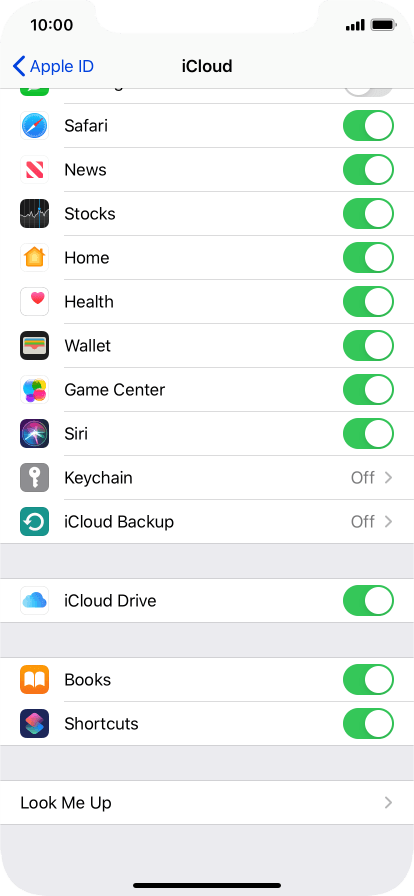 Press the indicator next to "iCloud Drive" to turn file synchronisation on or off.