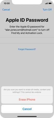 Key in the password for your Apple ID and press Erase iPhone. Wait a moment while the factory default settings are restored. Follow the instructions on the screen to set up your phone and prepare it for use.