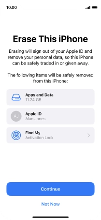 Key in the password for your Apple ID and press Erase iPhone. Wait a moment while the factory default settings are restored. Follow the instructions on the screen to set up your phone and prepare it for use.