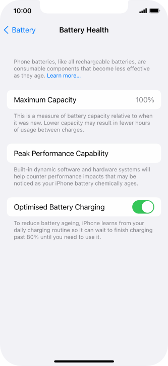 Press the indicator next to "Optimised Battery Charging" to turn the function on or off.