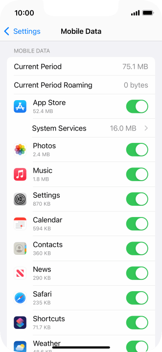 Press the indicator next to "Mobile Data" to turn the function on or off.
