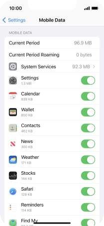 Press the indicator next to "Mobile Data" to turn the function on or off.