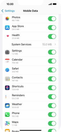 Press the indicator next to "Mobile Data" to turn the function on or off.