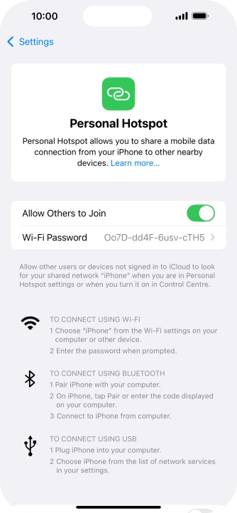 Key in the password for the personal hotspot and establish the connection.