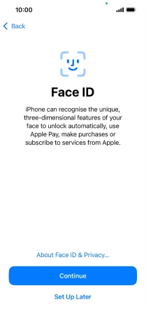 Follow the instructions on the screen to turn on use of Face ID or press Set Up Later.