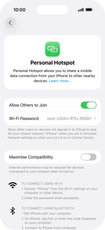 Key in the password for the personal hotspot and establish the connection.