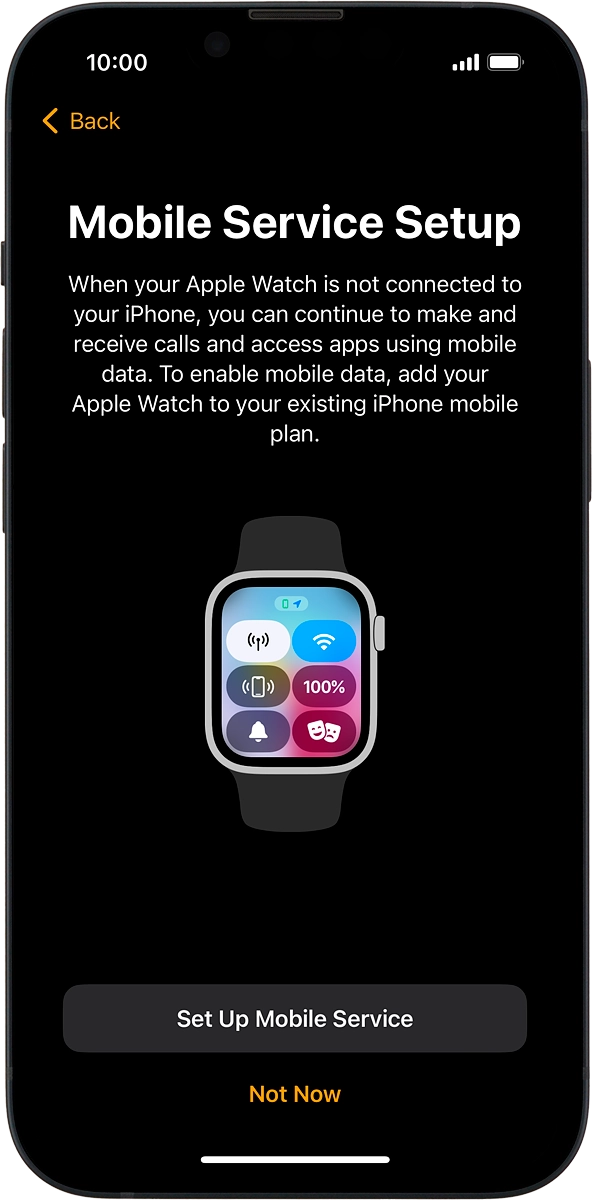On your phone: Follow the instructions on the screen to set up mobile data on your Apple Watch or press Not Now.