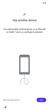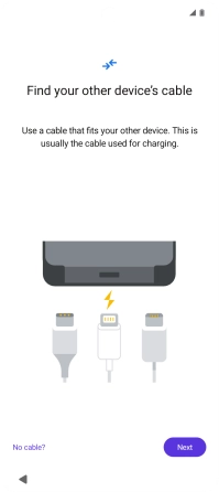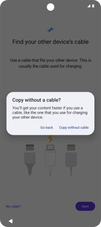 If you have a cable which can connect the two phones, insert the cable and follow the instructions on the screen to transfer content to your phone. If you don’t have a cable, press No cable?.