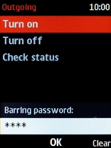 Key in your barring password and press the Navigation key. The default barring password is 0000.