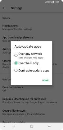 To turn on automatic update of apps using Wi-Fi, press Over Wi-Fi only.
