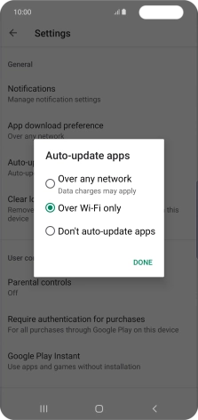 To turn on automatic update of apps using Wi-Fi, press Over Wi-Fi only.
