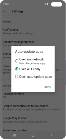 To turn on automatic update of apps using Wi-Fi, press Over Wi-Fi only.