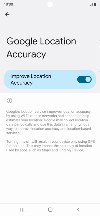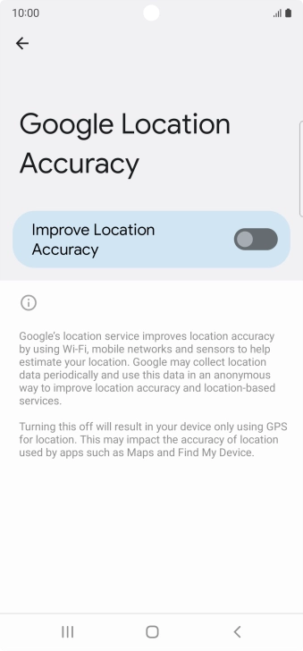 If you press the indicator next to "Improve Location Accuracy" to turn off the function, your phone can find your exact position using the GPS satellites but it may take longer as there is no access to supplementary information from the mobile network or nearby Wi-Fi networks.