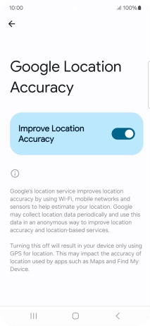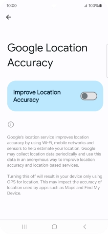 If you press the indicator next to "Improve Location Accuracy" to turn off the function, your phone can find your exact position using the GPS satellites but it may take longer as there is no access to supplementary information from the mobile network or nearby Wi-Fi networks.