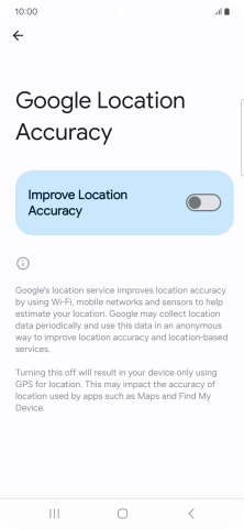 If you press the indicator next to "Improve Location Accuracy" to turn off the function, your phone can find your exact position using the GPS satellites but it may take longer as there is no access to supplementary information from the mobile network or nearby Wi-Fi networks.