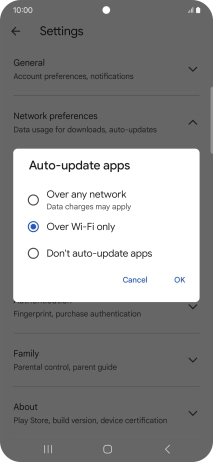 To turn on automatic update of apps using Wi-Fi, press Over Wi-Fi only.